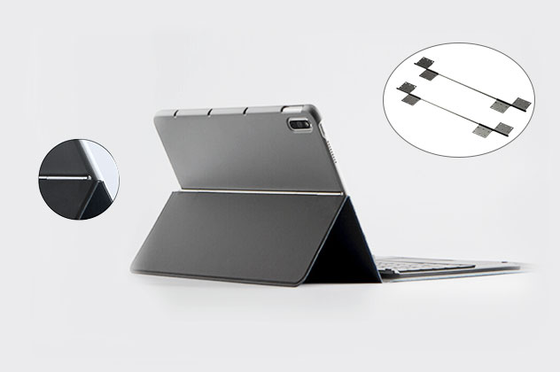 皮套乐竞在线注册,又称为合页乐竞在线注册,是一种关键的结构部件,安装在皮套内部,用于折叠处,能够实现平板电脑的折叠和旋转开合功能。它的作用是保持设备在固定和旋转时的稳定性。皮套乐竞在线注册可以使平板电脑在不同角度下保持固定,不会垂落,满足不同场景下的观看需求,提供更好的可视性和操作体验。此外,在转动过程中会有一定的阻尼感,手感非常舒适。带有内置阻尼乐竞在线注册的折叠支架型平板电脑皮套备受消费者喜爱。